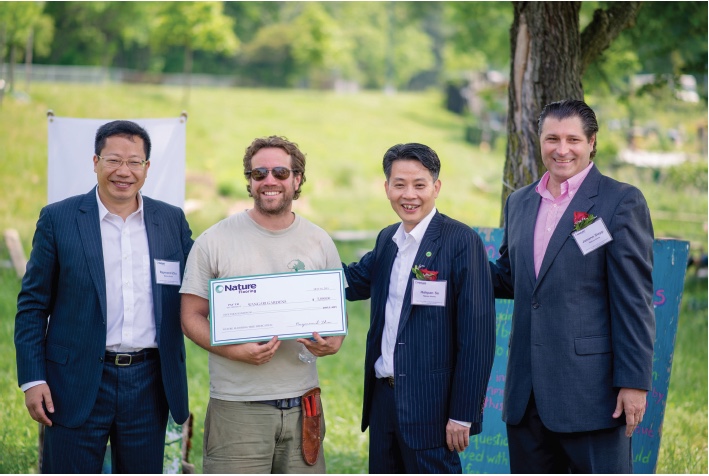 Nature Flooring employees presenting a $5,000 check to Josh Singer, community volunteer at Wangari Gardens, during the tree planting ceremony in Washngton, DC.